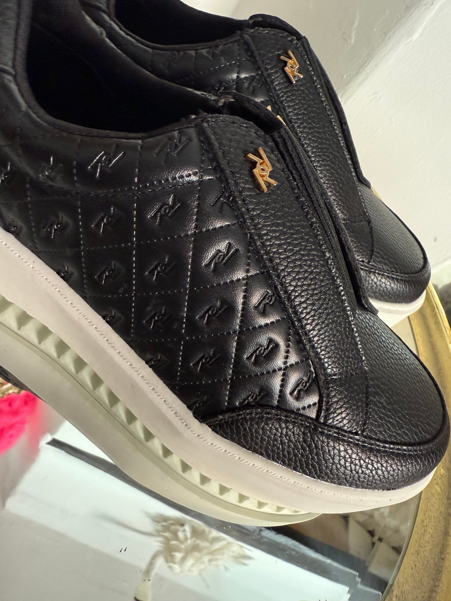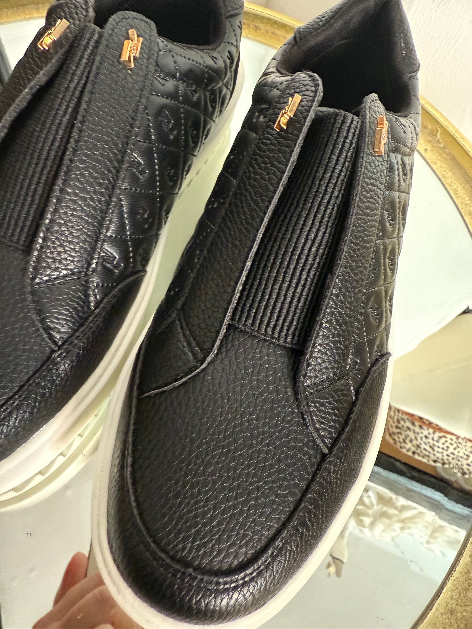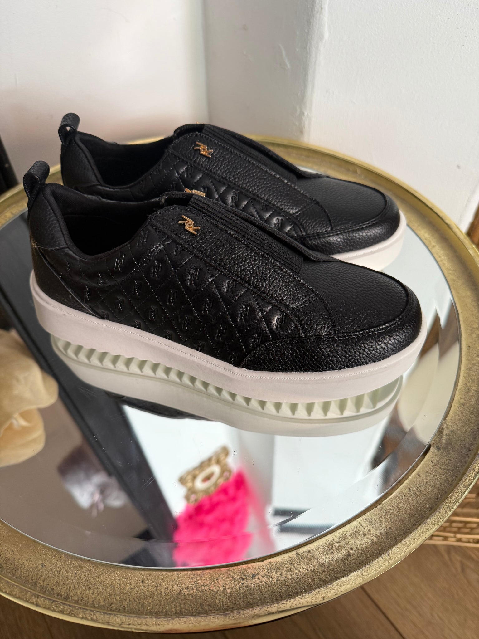 Black faux leather slip on trainers