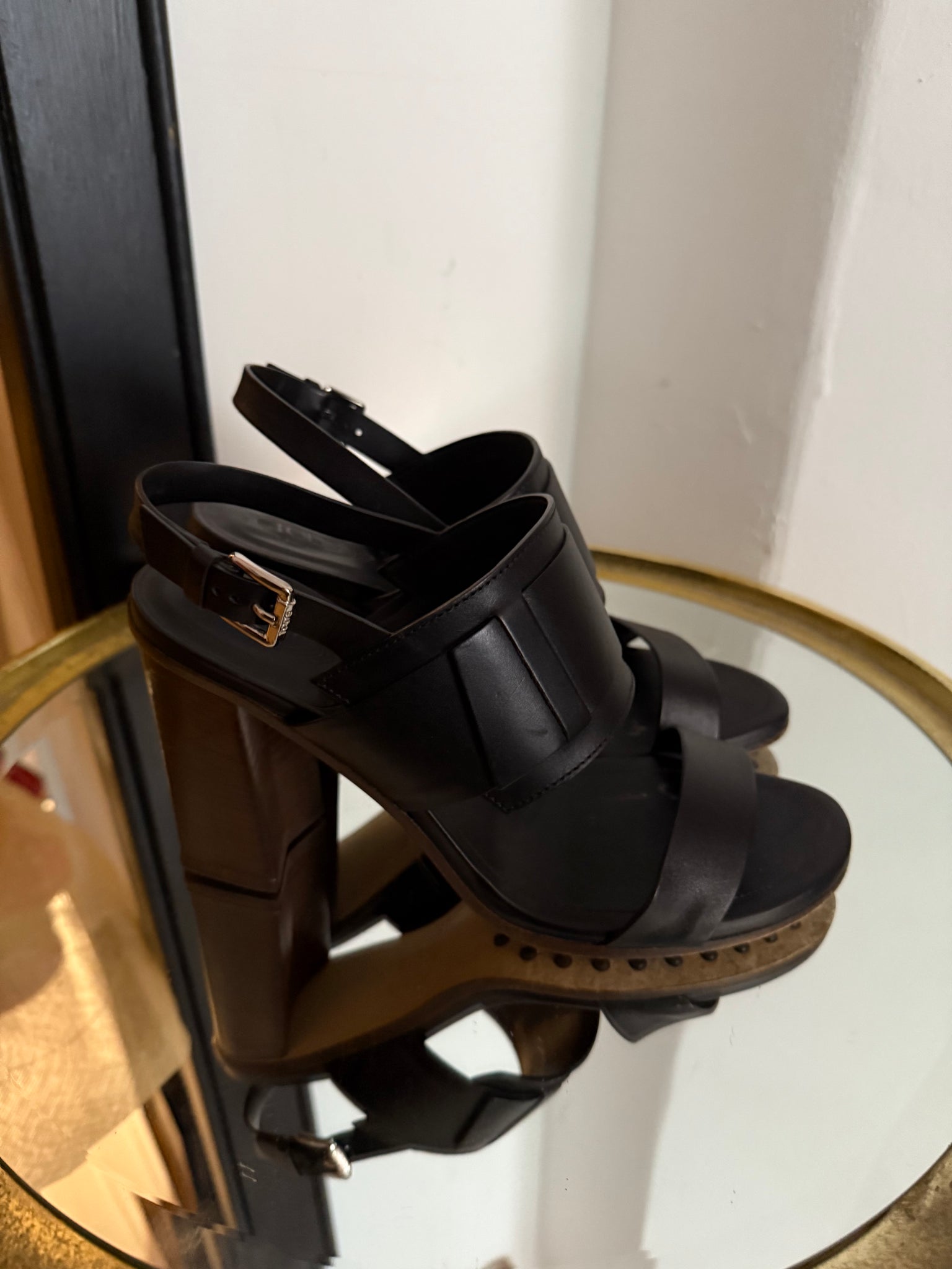 Black strap sandals with block heel and silver hardware