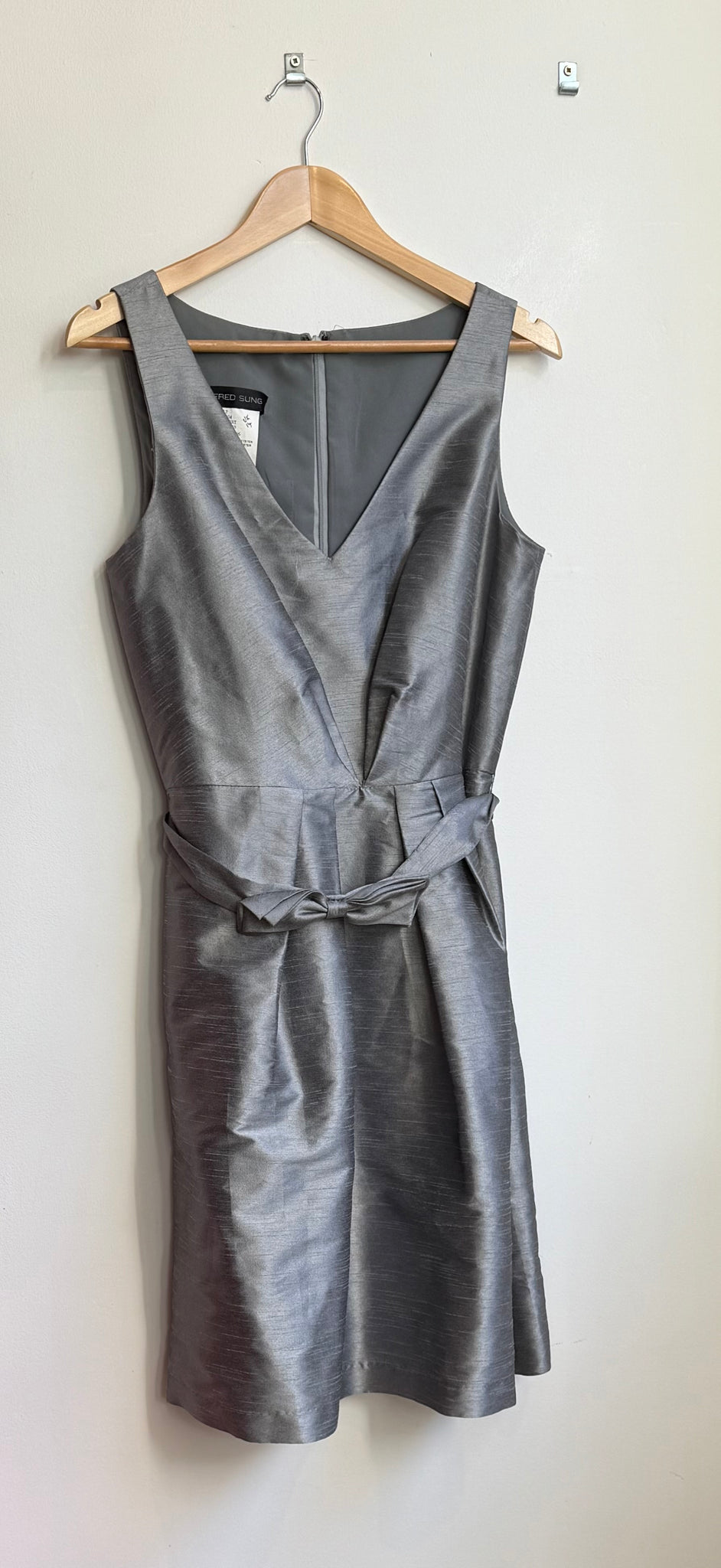 Light grey (Quarry) cocktail dress with bow detail. Pockets